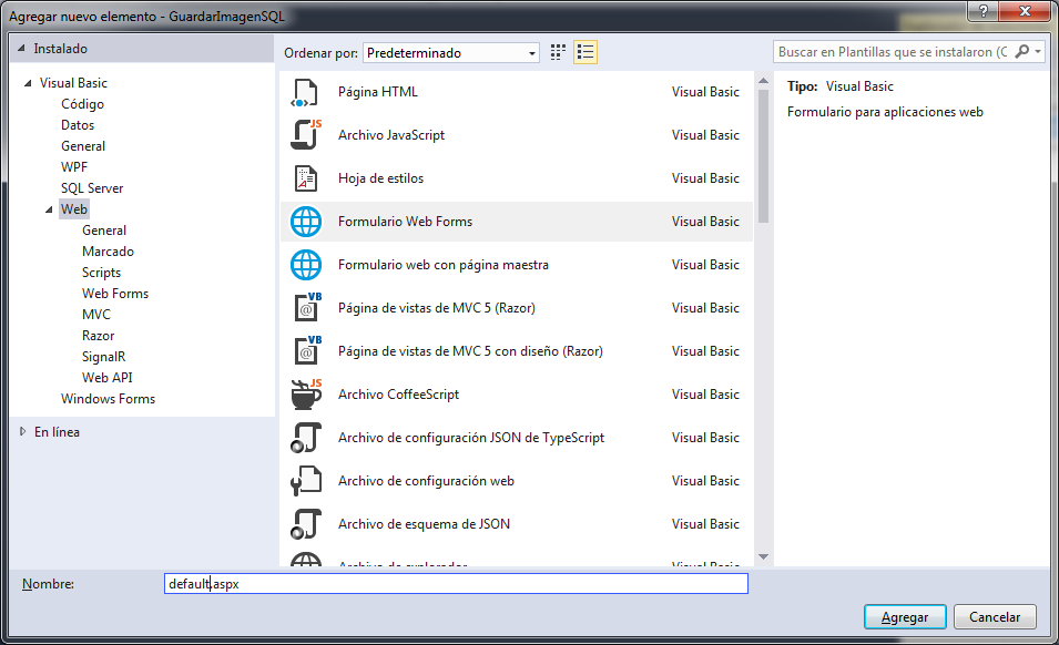 Paso 3. Seleccionar y agregar un Formulario Web Forms con el nombre default.aspx.