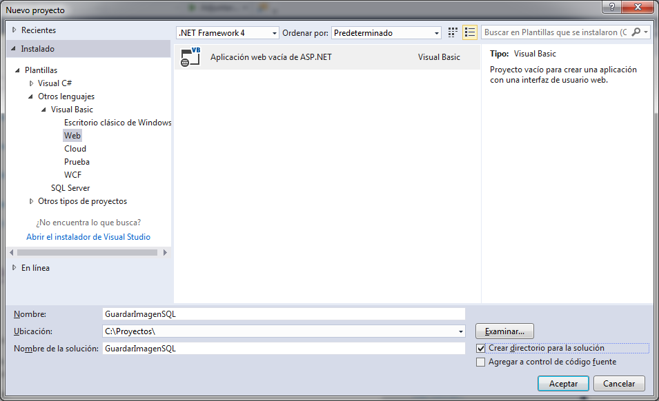 Paso 1. Abrir Visual Studio y crear un proyecto web vacío en C# o Visual Basic.